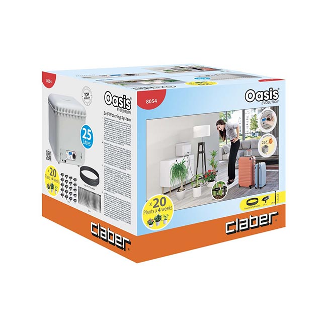 автоматична капкова поливна с-ма на батерии „Oasis Evolution“ от 7 до 28 дни Claber е идеалното решение за всеки, който търси надеждно и лесно напояване на растенията си. Системата е компактна, ефективна и напълно автономна, което я прави подходяща за всякакви условия и потребители.