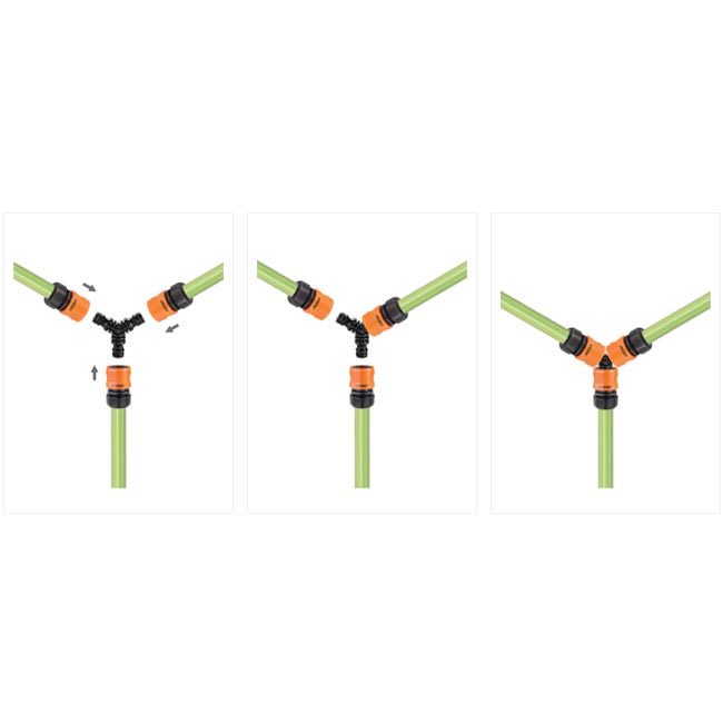 Продуктът е предназначен за свързване на три маркуча, като трансформира една водна линия в две. Подходящ е за домашни и професионални градински системи.